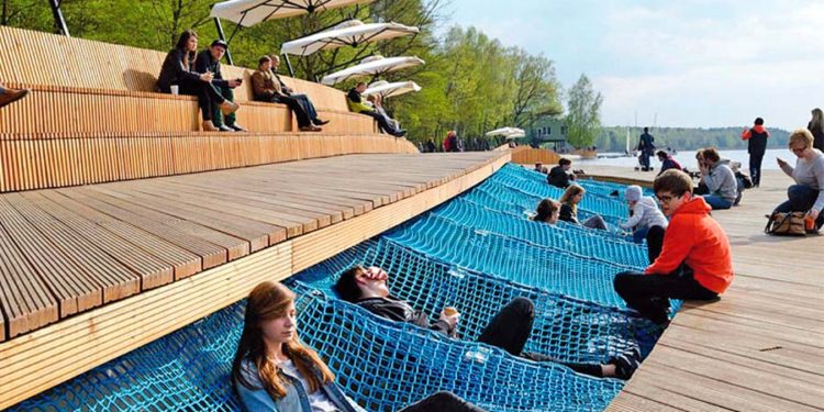Se incluyó además una abertura con una red estirada sobre el agua y bancos de diseño especial que podrían ser usado como tribuna. Para seleccionar los materiales se trató de privilegiar el carácter natural de la iniciativa. Así, parte de las construcciones se cubrieron por tierra y luego sembradas con césped, mientras que las bancas y barandillas están hechas con madera blanda. Para la iluminación se emplearon luces LED de bajo consumo energético.