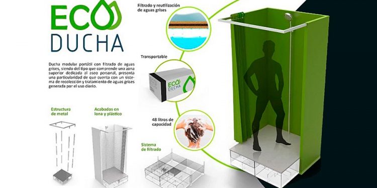 La “Ecoducha”, patentada ante Indecopi a inicios de año, funciona mediante un sistema a presión de pulverizador y reciclado del agua, que además de permitir el aseo personal dosifica el uso del agua y su reciclado con un menor gasto. La propuesta de valor del proyecto es no depender de conexiones ni de una red de suministro de agua, ya que el presurizador manual ayuda a generar la presión necesaria para impulsar el agua. La estructura comprende una cabina de ducha y una base donde se ubican los módulos de almacenamiento y filtrado, que son elaborados con materiales livianos, resistentes, durables y de fácil disponibilidad.
