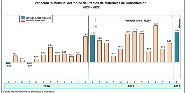 El Índice de Precios de Materiales de Construcción a nivel de Lima Metropolitana, correspondiente al mes de enero 2022, registró un incremento de 1.67%. En el periodo anual de febrero 2021 a enero 2022, acumula una variación de 15.55%.