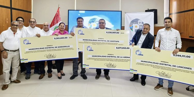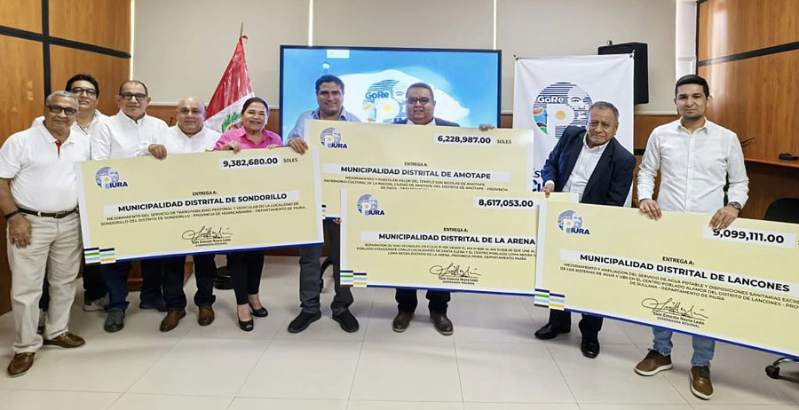 El gobernador regional Luis Neyra León entregó cheques simbólicos por un total de S/ 33.3 millones a los alcaldes distritales de Sondorillo, Lancones, La Arena y Amotape, recursos destinados a proyectos de agua potable, mejoramiento vial y recuperación del patrimonio cultural, en beneficio de miles de familias piuranas.